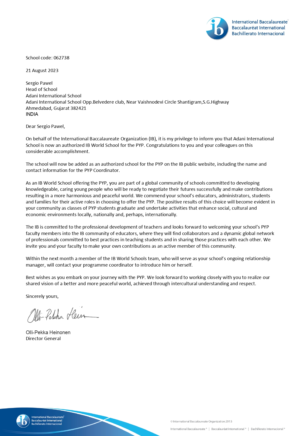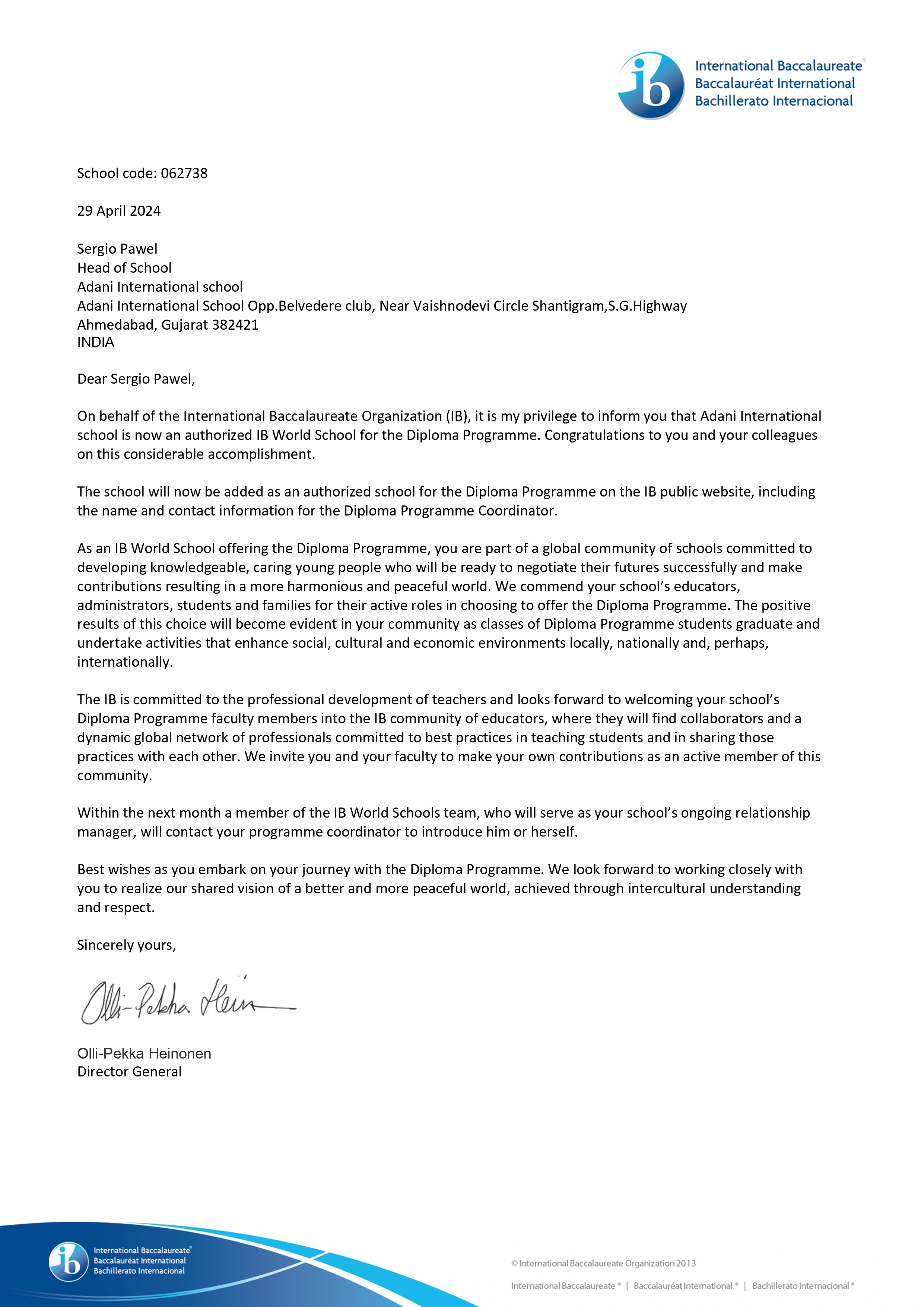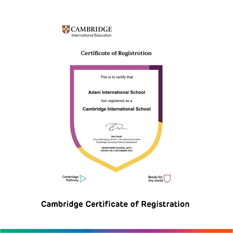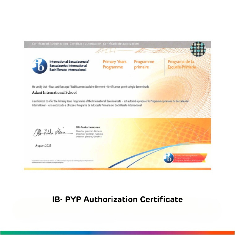 Adani International School is authorised by the International Baccalaureate Organization to offer the Primary Years Programme (PYP) and the Diploma Programme (DP), and is a Cambridge International School. These affiliations reflect the school’s commitment to high standards in teaching and learning, student wellbeing, and international-mindedness.